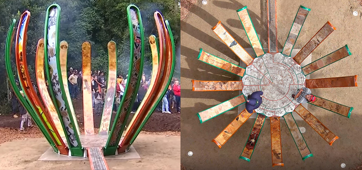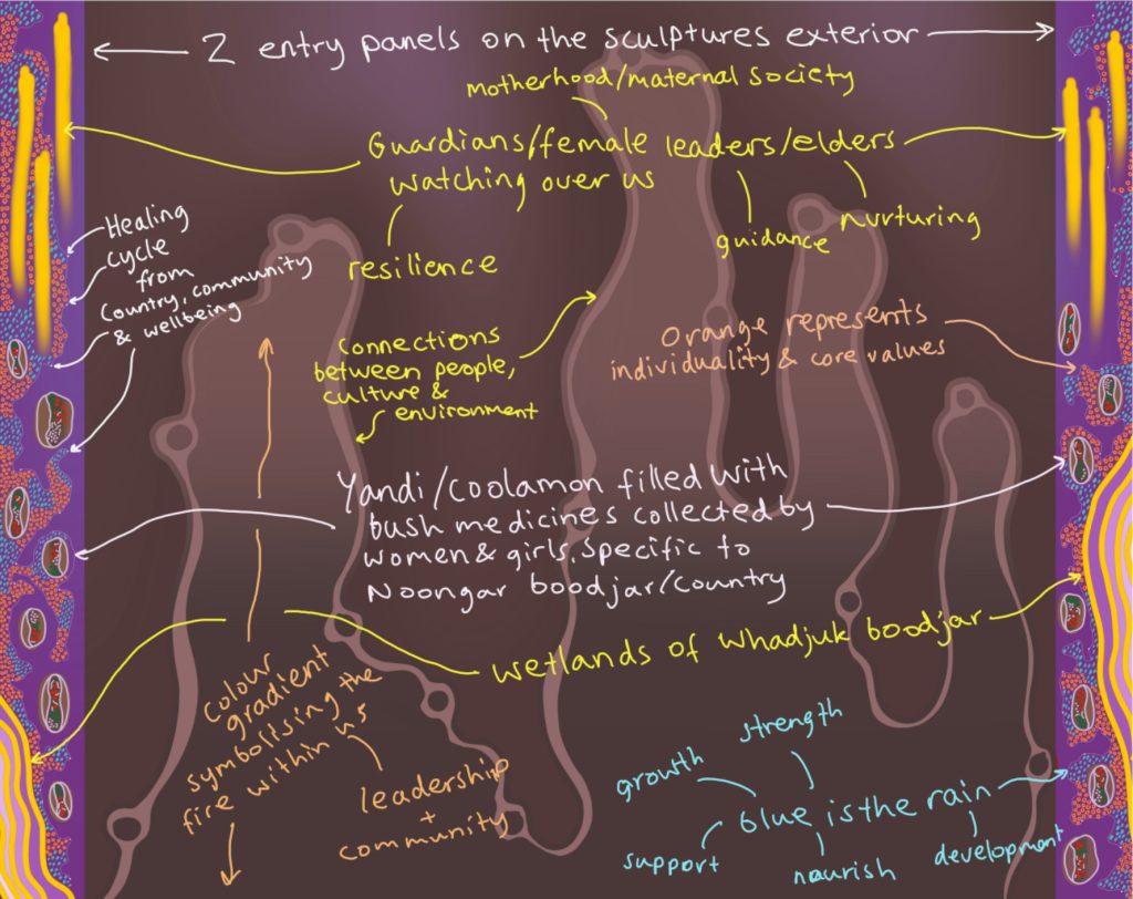 The external Noongar artwork on the left and right entrance petals (petal 1 and petal 15) is designed to connect to the surrounding petals of the sculpture (petal 2 to petal 14). The artwork on the entrance petals will be created by local Noongar artist Jade Dolman. The remaining surrounding petals, designed and led by Jade Dolman will be created in consultation with local elders and important community knowledge holders. Through a workshop school students will be given the opportunity to participate in creating the art for petals 2 to 14.