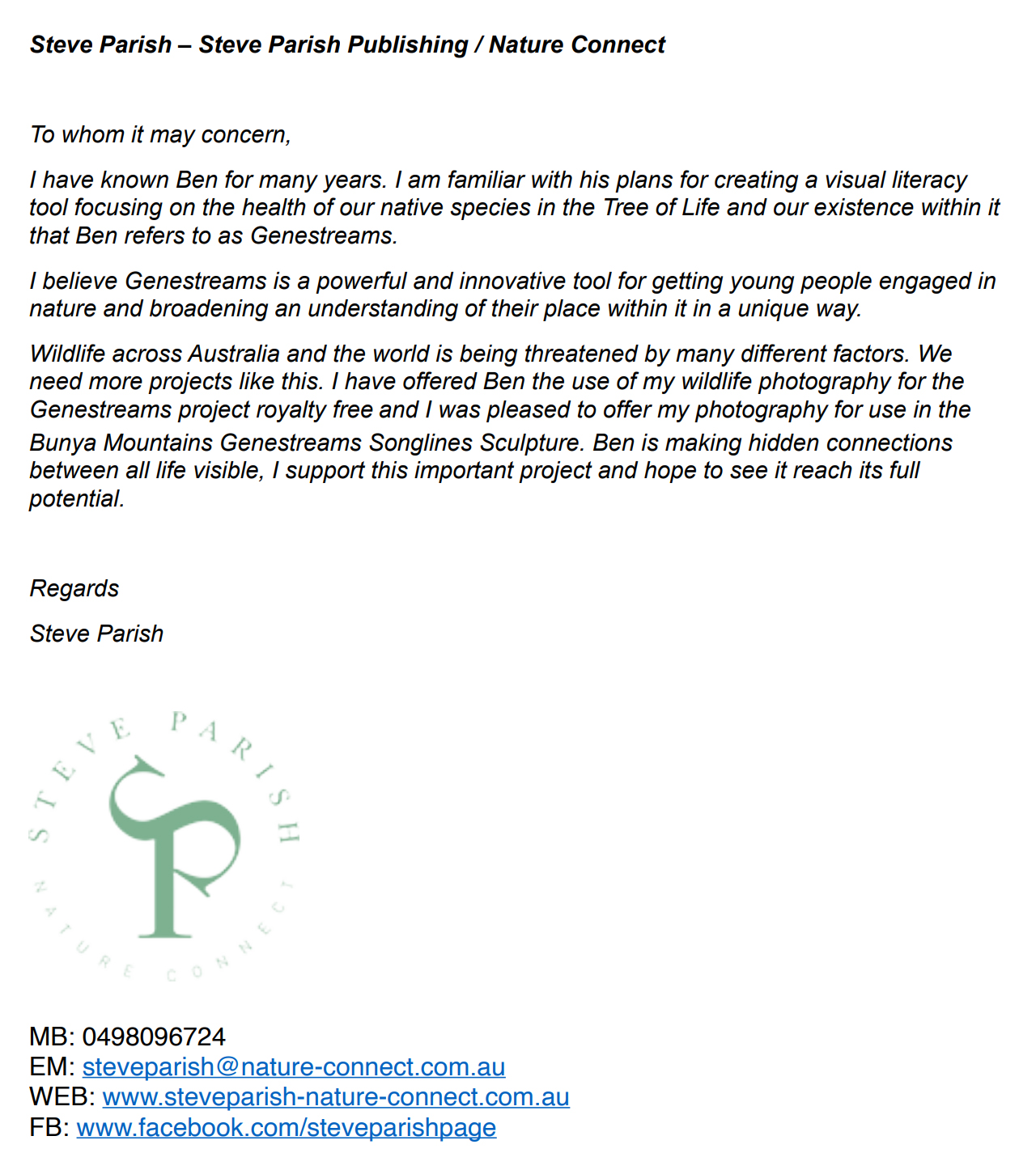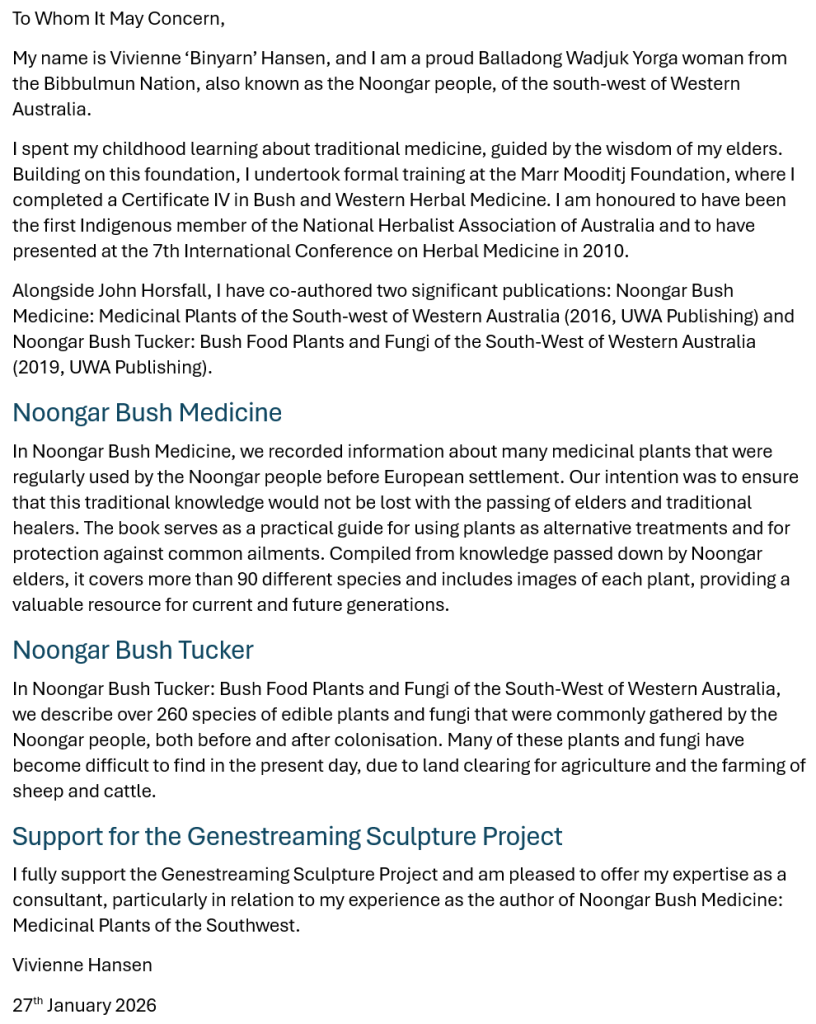 - Vivienne Hansen –author of Noongar Bush Medicine, Medicine Plants of the South West. She supports the Genestreaming Sculpture project and is happy to act as a consultant to the project in guiding our team in which plants to include to promote an awareness of bush medicine in the community.