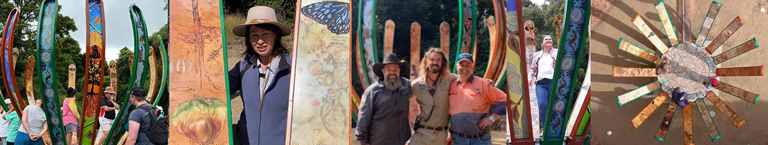 Denmark Genestreaming Sculpture -Left to right: Mark Hewson – engineering/structural design, Aunty Carol Pettersen – co-founder/cultural advisor, Ben Beeton co-founder, sculpture design, field naturalist art, Mali Moir – scientific illustrator, botanical illustration workshops, Gary Muir – shared ancestry research.