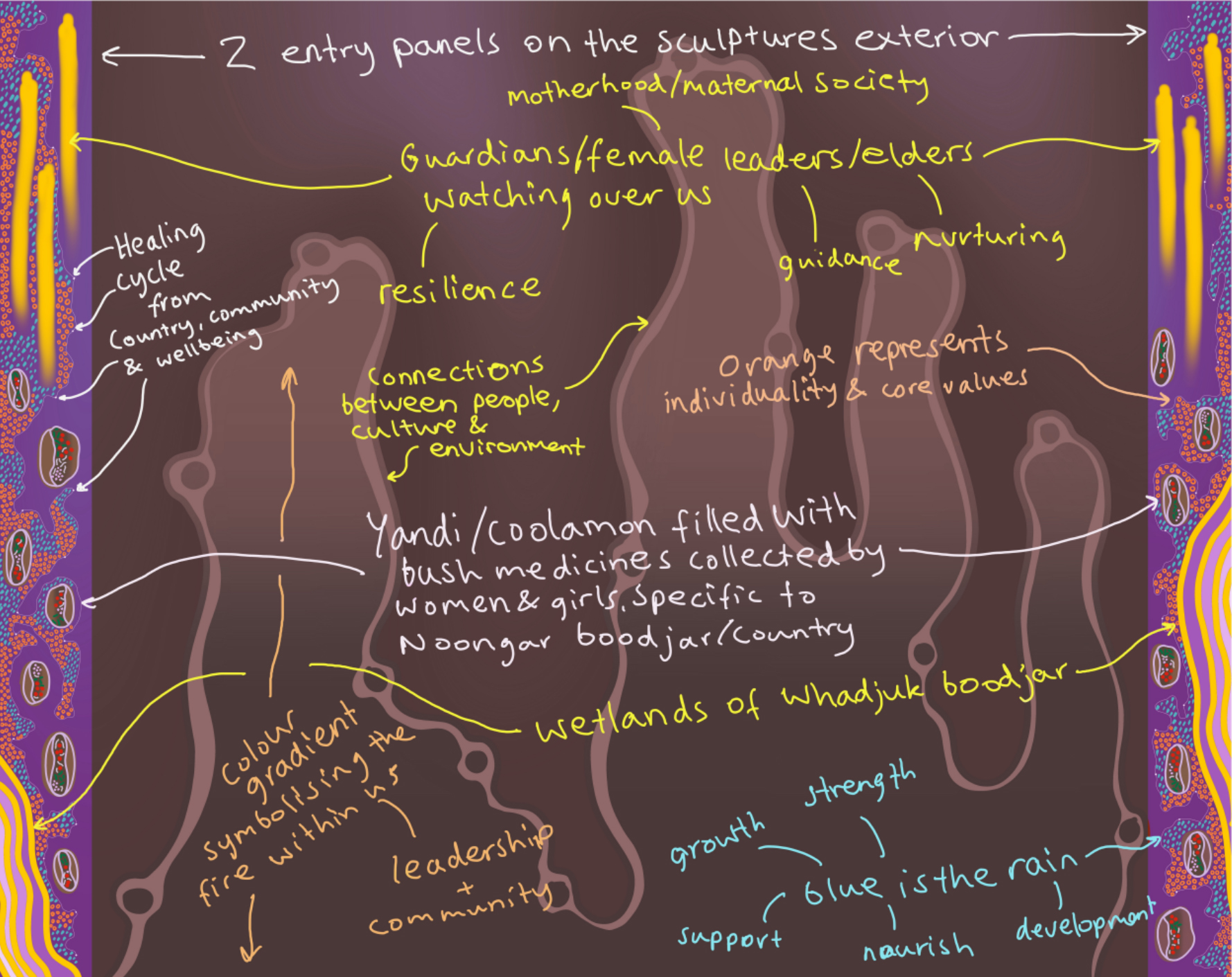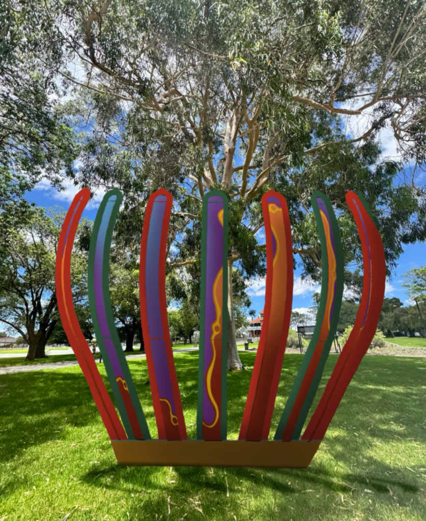 The theme of Symbolic Connections and conceptual approaches that reference healing, strength, and care-giving will be reflected through symbolic connections through forms that suggest shelter, circles of support, and pathways of renewal. By drawing on motifs that speak to healing, strength, and care-giving, the sculpture will evoke the way community holds and restores its people. Layers of meaning — in materials, pattern, and story — will invite viewers to reflect on shared responsibility, resilience, and the power of caring for one another and for Country.