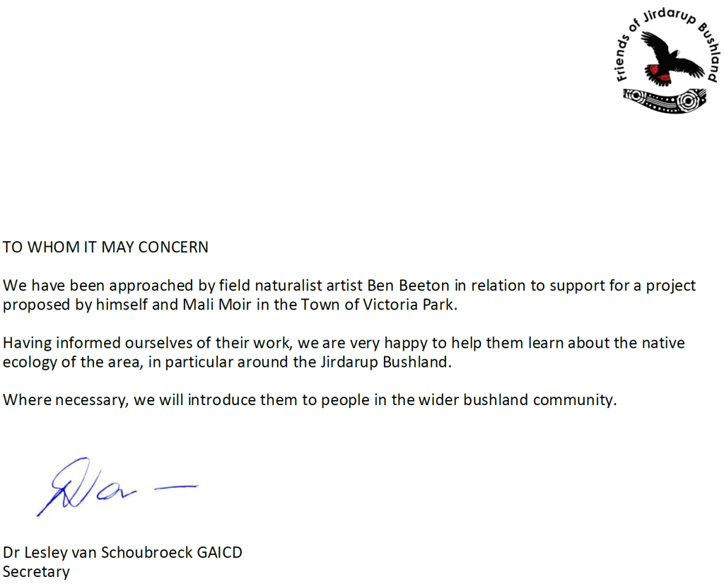 With community participation the field naturalist art will focus on cultural connections with the local ecosystems, the local geological story, endangered species, and their shared ancestry through deep time on the inside of the sculpture. Ben Beeton & Mali Moir will consult with Vivienne Hansen, Friends of Jirdarup Bushland, The Western Australian Herbarium, Professor Hans Lambers & River Guardians in the creation of the field naturalist artwork for the project. The community will have 2 months free access to the explore nature journaling resource kit which will provide guidance in the creation of nature journaling art that community individuals can submit for inclusion in the field naturalist art featured in the sculpture. https://sciart.com.au/theartofnatureschool/ Photographer Steve Parish has offered his extensive photographic library for use in the genestreaming sculptures initiative. We will incorporate photographs of species from the Victoria Park region in the sculpture.