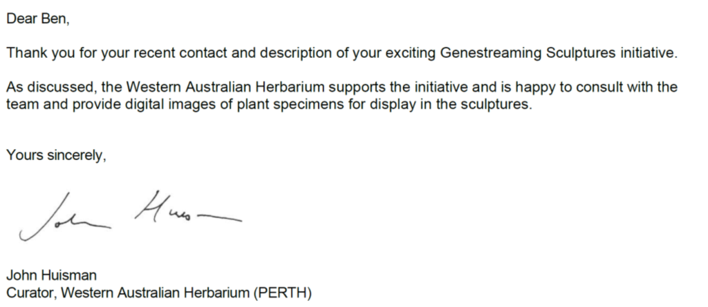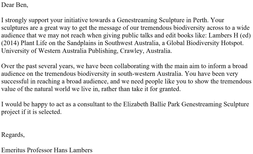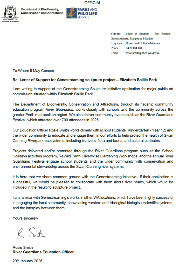 If developed this sculpture will become the Perth connection of the national tourism trail of Genestreaming sculptures. We currently have projects in Qld, NT, WA and Singapore Gardens by the Bay. With the proven participation of communities across Australia and abroad the Genestreaming Sculptures national trail program facilitates new possibilities for Education, Cultural Tourism & Eco-Tourism engagement.