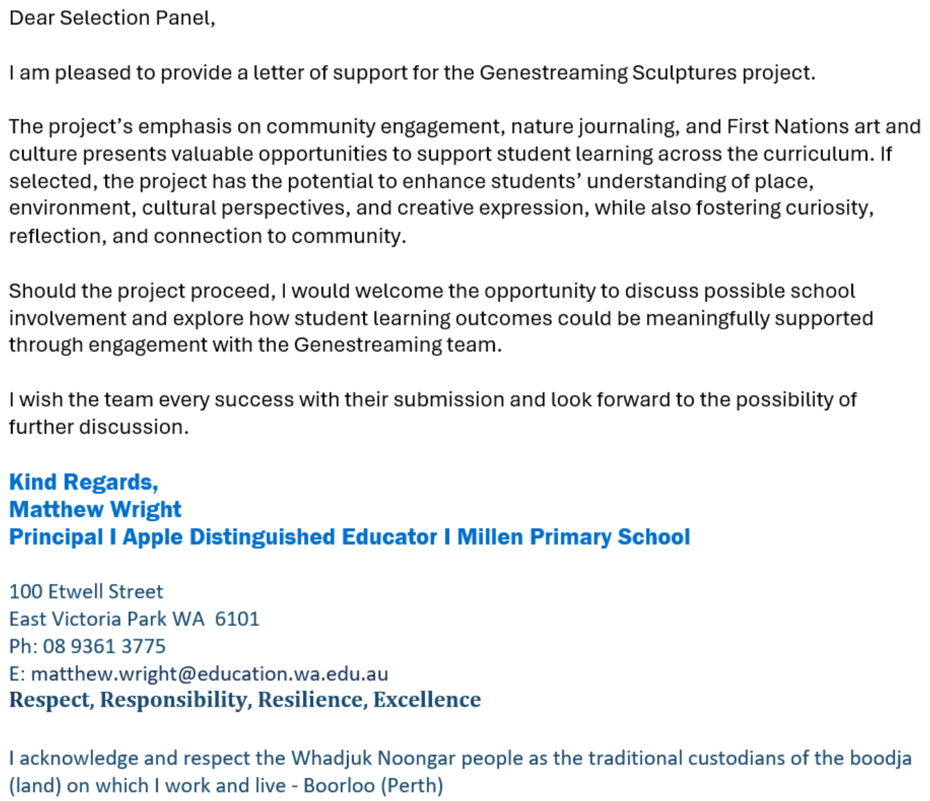 We propose to develop this project through meaningful engagement. Elders, environmental experts and youth will be actively involved through consultation and in the creative process. Traditional language will be incorporated into the art where culturally appropriate, strengthening place-based identity and connection. The success of this project will be measured not only by the completed installation, but by its ability to foster ongoing dialogue, reflection, conservation awareness and healing — creating a public artwork that is owned by community, respected by place, and valued over time.