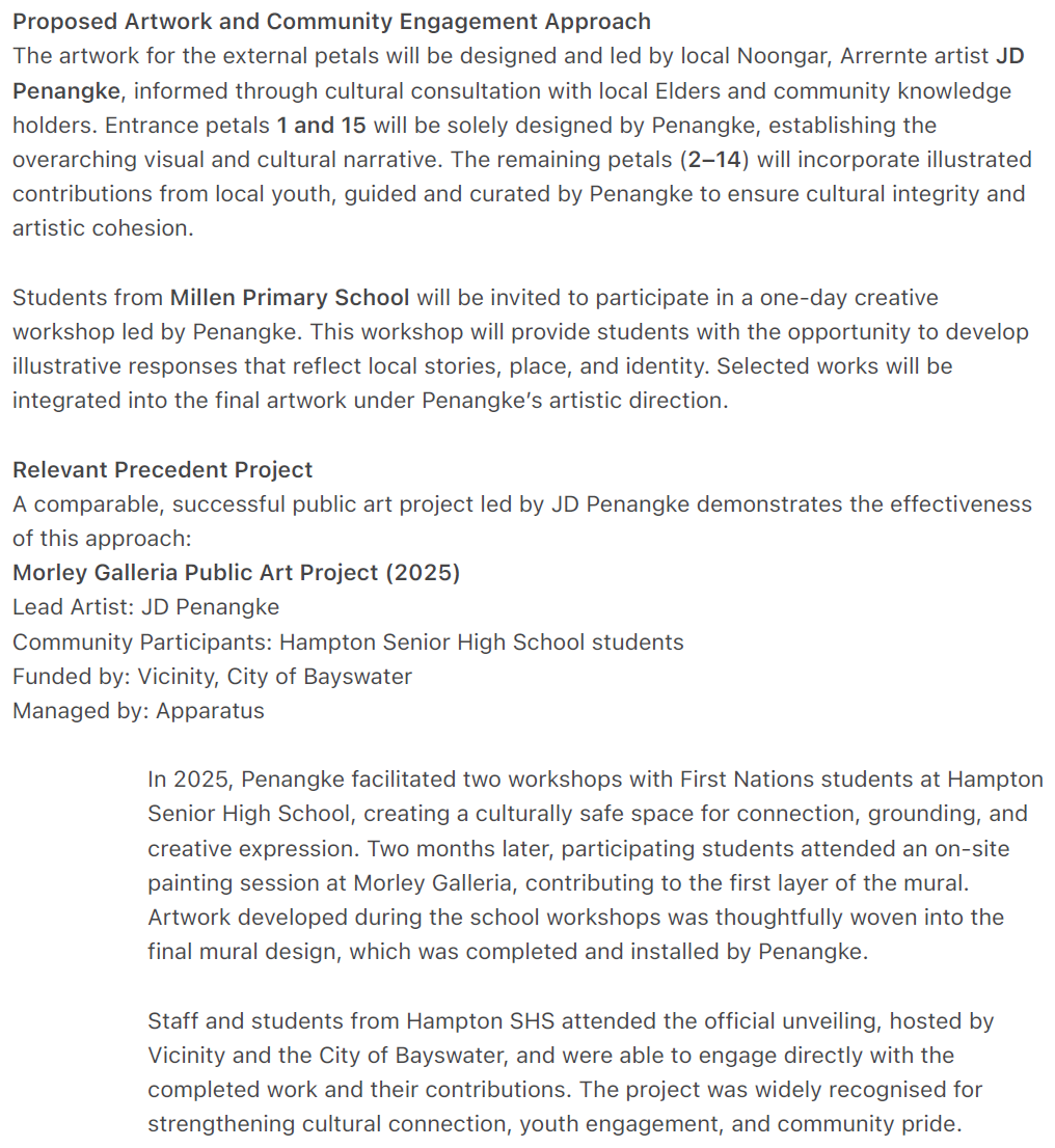 Visual Concept Design – The artwork for the external petals will be designed and led by local Noongar, Arrernte artist JD Penangke, informed through cultural consultation with local Elders and community knowledge holders. Entrance petals 1 and 15 will be solely designed by Penangke, establishing the overarching visual and cultural narrative. The remaining petals (2–14) will incorporate illustrated contributions from local youth, guided and curated by Penangke to ensure cultural integrity and artistic cohesion.